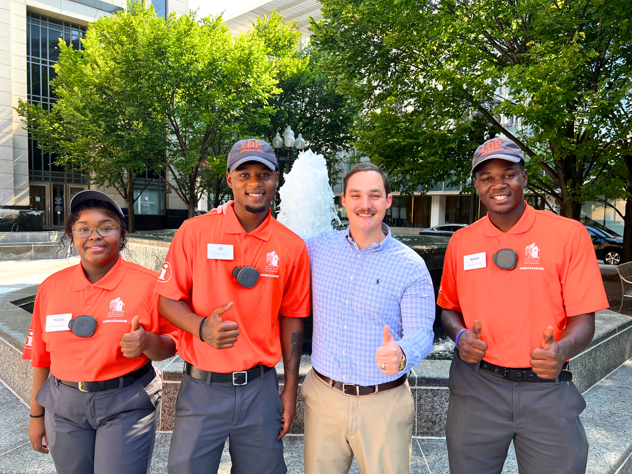 Louisville General Manager Jake White (blue) stands alongside Louisville Downtown Partnership Hospitality Ambassadors Kiara, J.D. and Isaiah (left to right).