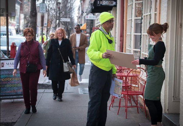 Dwayne Brooks, a greeter with the Downtown Frederick Ambassador Program, hands out maps of the town to area businesses people like Gillian Berluti, manager of Firestone’s Market on North Market Street.
